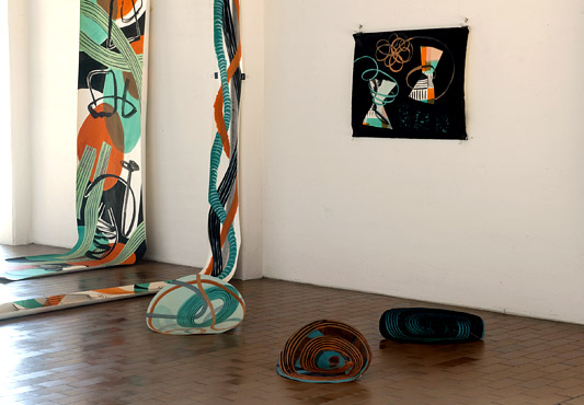 Rollbilder im Raum, Kunstverein Wesseling, Scheunengalerie Schwingeler Hof, 2012 Ansicht 6: Zwei Rollbilder, 2011, 450 x 107,5 cm und 16,3 m x 0,36 m drei kelchförmige Objekte, 2011-12, Acryl auf Papier, Hold the line, 2011, Acryl auf Papier, 78 x 108 cm Foto: Thomas Mayer |